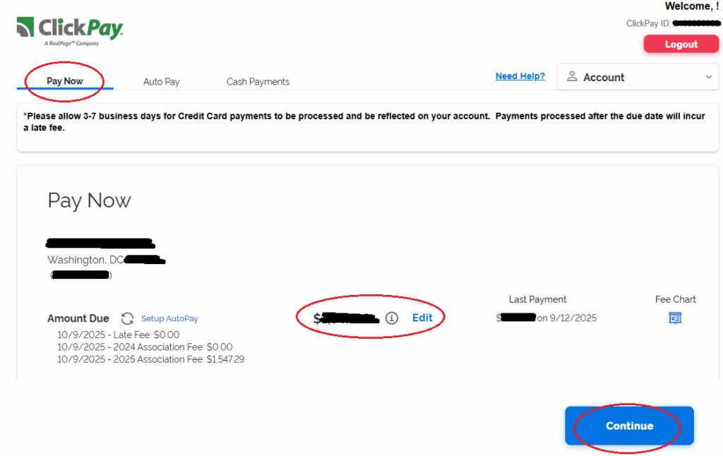 If you wish to make a one-time payment, go to the Pay Now tab. If the amount shown is correct, simply click the Continue button to pay that amount. If you would like to pay more or less than what is shown, click EDIT and adjust prior to clicking Continue.