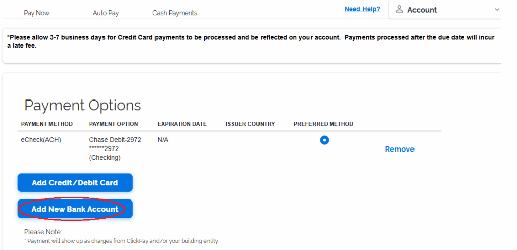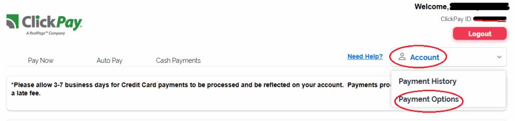 You’ll be taken to the ClickPay page where you can add a payment method by clicking Account > Payment Options.