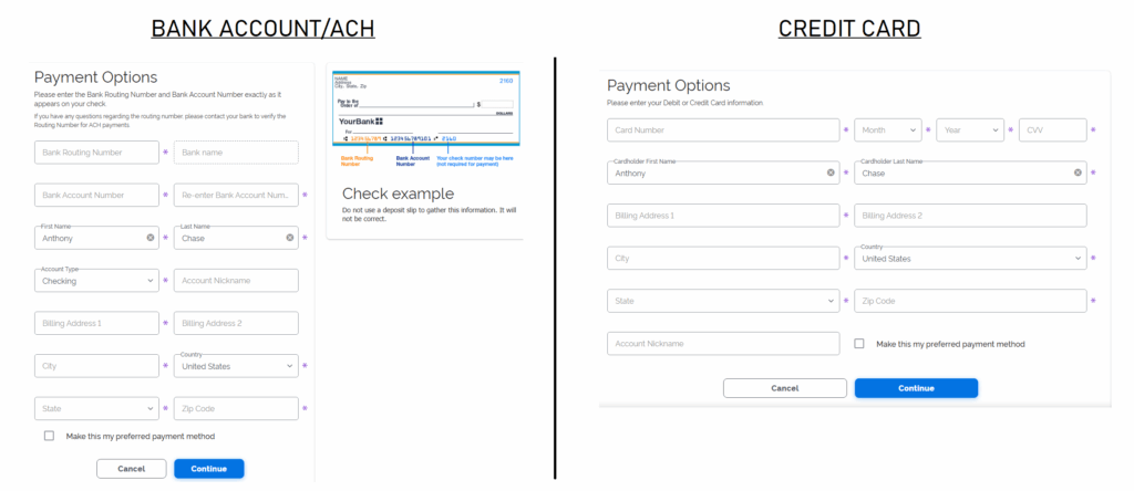 You may pay with a bank account or a credit/debit card. (We advise using a bank account, because the company charges a processing fee for credit cards. A Fee Chart may be found on your ClickPay “Pay Now” page.)