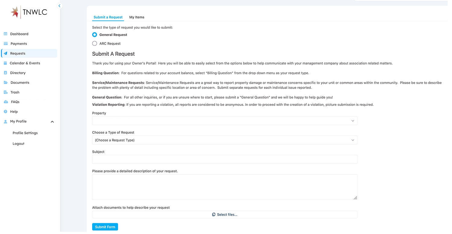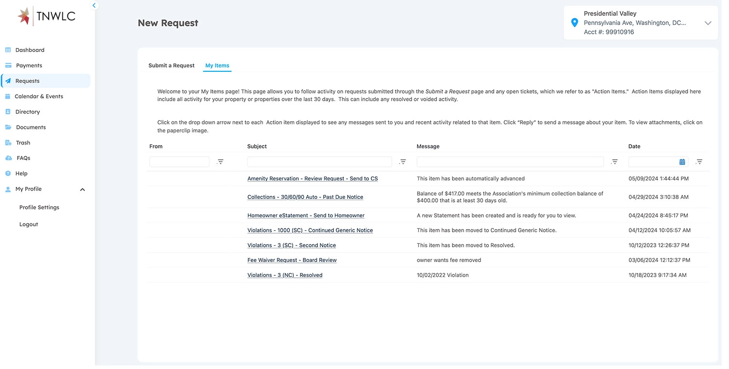 On the Requests page, homeowners can not only see outstanding or recently closed items for their account, but they can also submit new requests that will create an Action Item in your system.